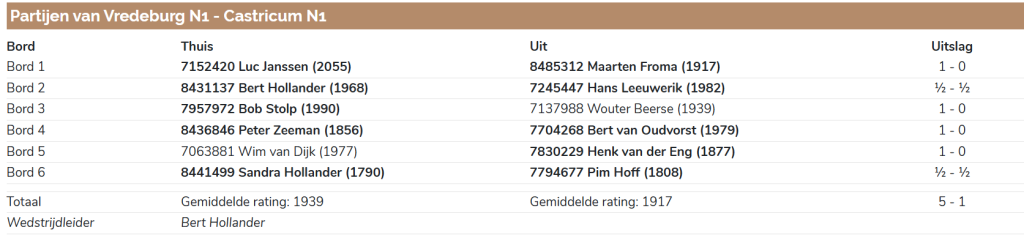 | Jappe Koppenaal 1559 C | – | Alex van der Leest 1454 D | 1-0 |