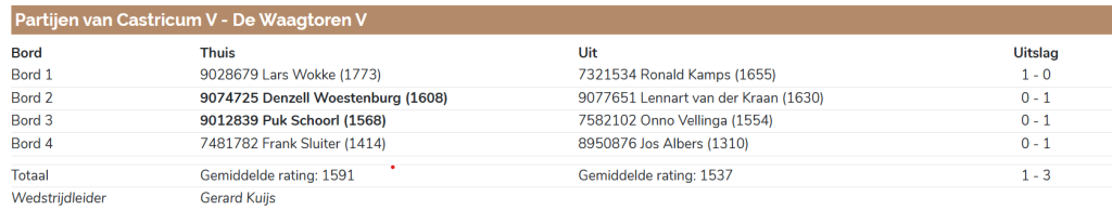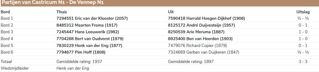 Snelste klaar was Eric van der Klooster tegen Piet Kuijs. Dat is een zeldzame gebeurtenis en waarschijnlijk dacht Eric: ik voel mij niet top vandaag, maar als ik afbel krijg ik 1/3 punt dus ik bied Piet remise aan en hopelijk accepteert hij dat en pak ik toch een half… Als dat zo was had Eric het goed getaxeerd, want Piet durfde het aanbod na luttele zetten door de sterkere clubkampioen niet af te slaan. Want het zal wel best wat jaren geleden zijn dat Piet van Eric heeft gewonnen, dus goed gedaan Piet!