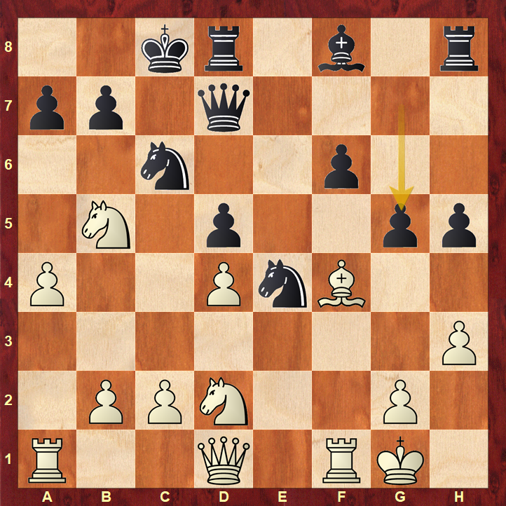 Zwarts voordeel is inmiddels als sneeuw voor de zon verdwenen. Over deze stelling hoefde ik niet lang te denken. In het schaakleer programma Chessity is dit gesneden koek voor mijn leerlingen. Hoop ik dan maar. Zwart heeft zojuist Pe7-d5 gedaan maar Kg8-f7 was actiever. Dan kan daarna Lg7-e5.