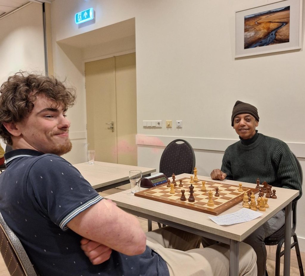 Jappe Koppenaal won van Frank ‘ik heb goed gespeeld’ Sluiter. Het ging lang gelijk op maar Jappe wist steeds een pionnetje mee te pakken. Zo keek Frank uiteindelijk tegen een achterstand van wel 4 pionnen aan. Hij gaf daarom terecht op.