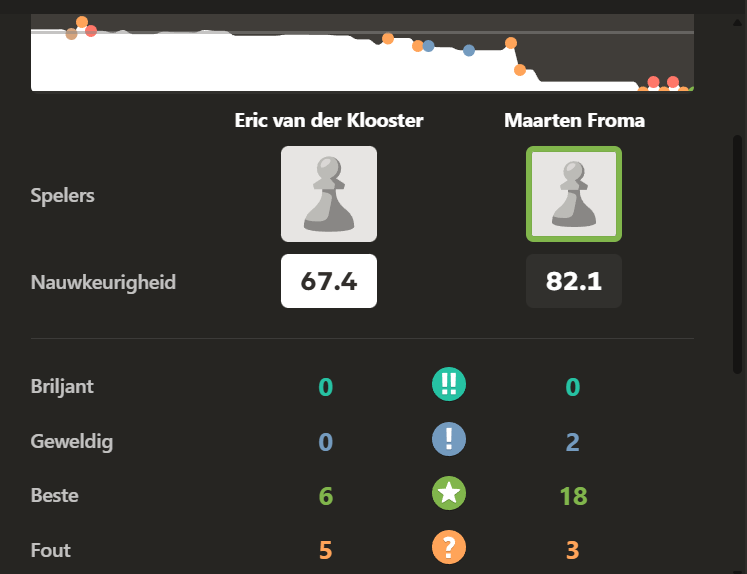 Maarten Froma won knap met zwart van clubkampioen Eric die weinig bereikte in zijn Philidor in de voorhand. Het was de tweede overwinning van Maarten dit seizoen op Eric, die normaal niet zo gauw verliest. Waarschijnlijk had Eric een off-day want zijn partijprecisie lag op 67% terwijl Maarten boven de 80 kwam. Vooral in het middenspel produceerde Eric een flink aantal missers en dat brak hem uiteindelijk op. Zie partijen naspelen