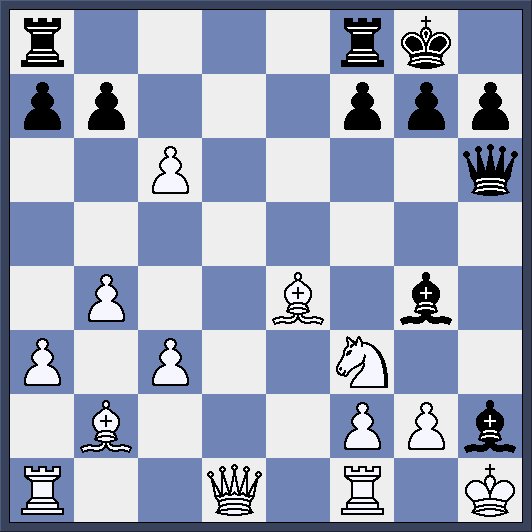 18.Nxh2 Bxd1 19.cxb7 Rae8 20.b8Q Rxb8 21.Raxd1 Rfd8 22.Bd5 Qg6 23.c4 Qc2 24.Be5 Rbc8 25.Nf3 Qb3 26.b5 h6 27.a4 Qxa4 28.Ra1 Qb3 29.Rxa7 het voordeel loopt op… Rxd5 ..moet wel.. 30.cxd5 Qxb5 31.Rd1 g5 32.d6 g4 33.d7 Rd8 34.Bf6 gxf3 35.Bxd8 Qh5+ (wit wint nu als hij loper h4 speelt)